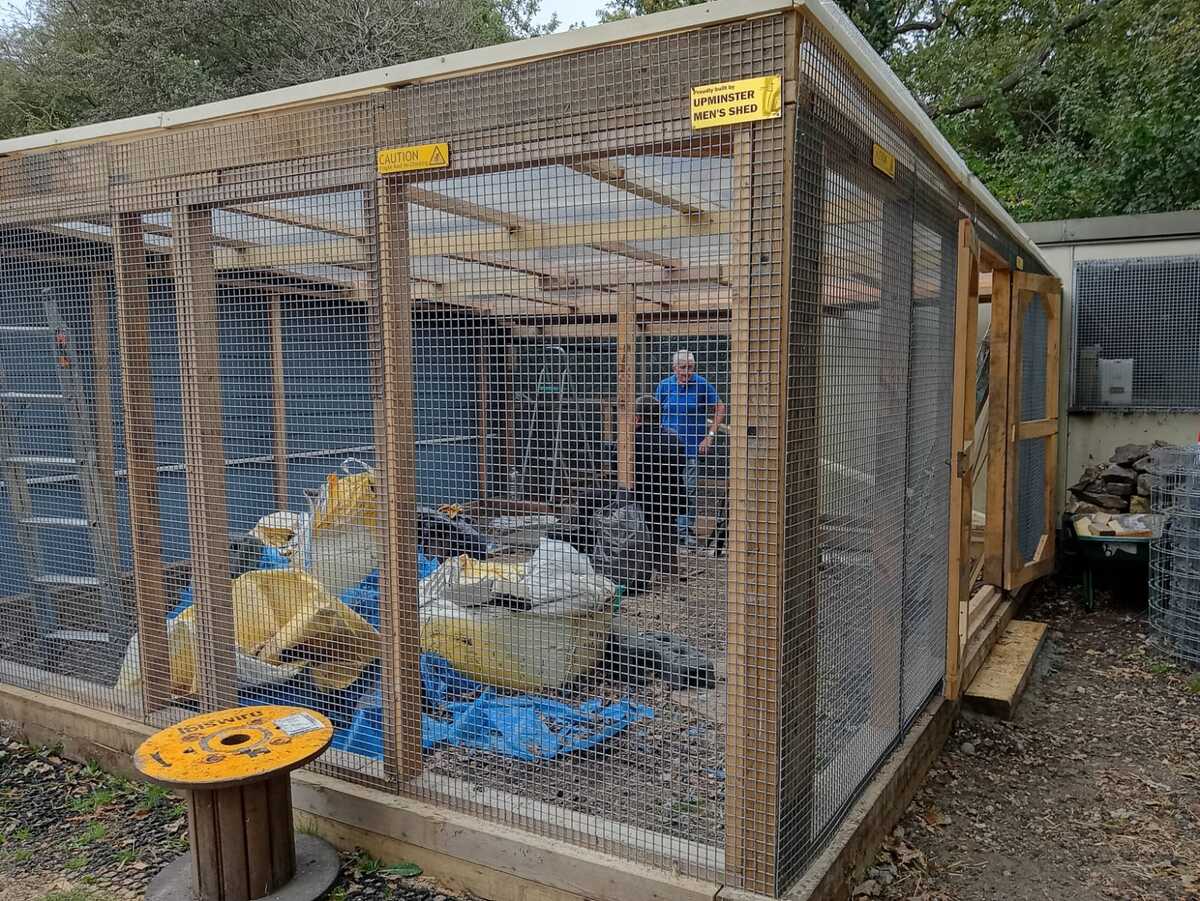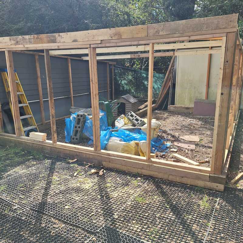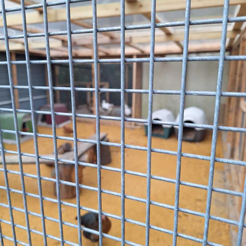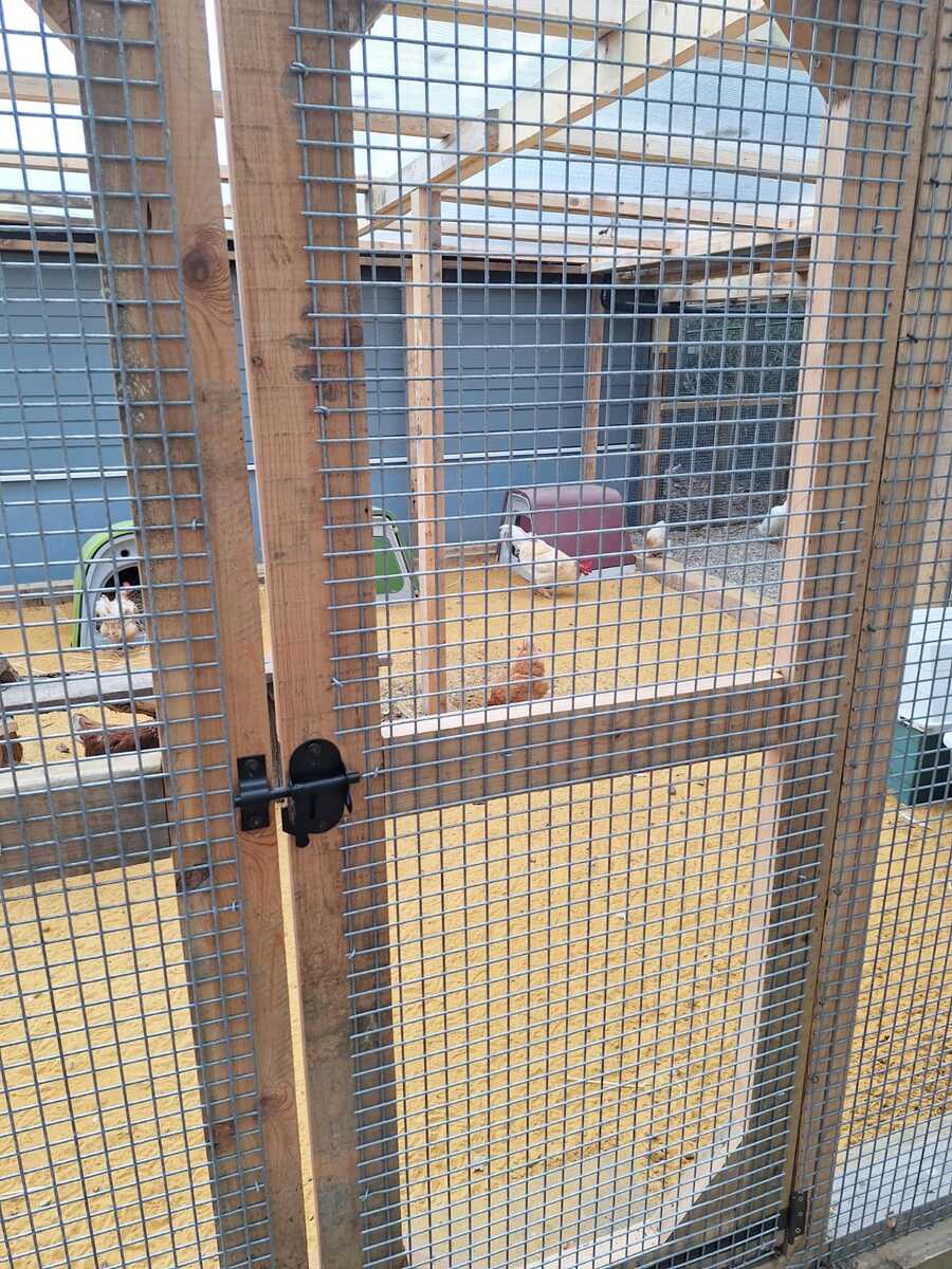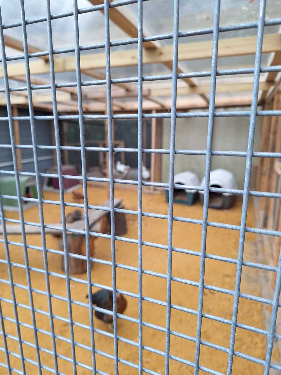 What Mens Shed have built is a solid timber frame with a polycarbonate roof and galvanised steel wire mesh and is predator proof. It has separate parts with fencing and a gate should we need to seperate off birds if need be. It adjoins our bird stable so the chickens and ducks and turkeys can come straight out from inside. A double door has also been built so we can access the run from outside.